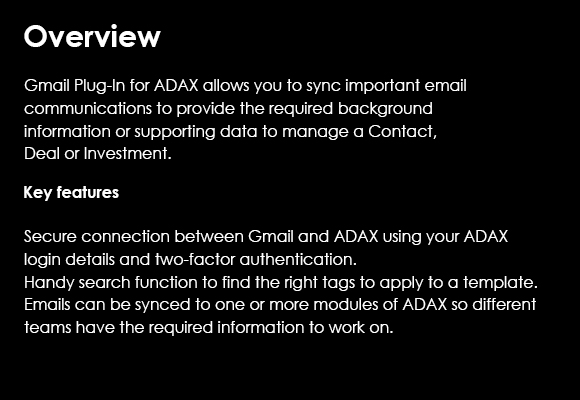 ADAX Online Gmail Plugin is available from the ADAX platform, to be downloaded and installed immediately. Its single sign on capability creates a seamless experience for the users to sync email threads from Gmail.